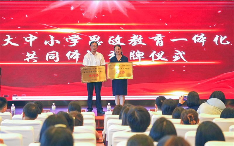 仪式上,谢鑫与曹鹤鸣共同为“大中小学思政教育一体化共同体”授牌。