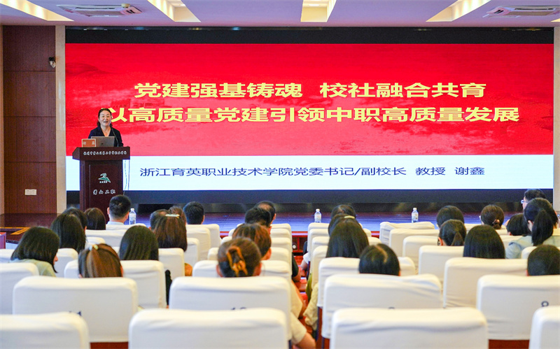 签约授牌仪式后,谢鑫为在场人员讲了《党建强基铸魂,校社融合共育,以高质量党建引领中职高质量发展》专题党课,进一步加深双方党员教师对高质量党建引领职业教育高质量发展的理解和认识,为后续的党建联建工作提供思想指引。