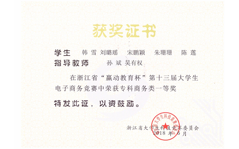 ●2018年获浙江省第十三届大学生电子商务竞赛一等奖;