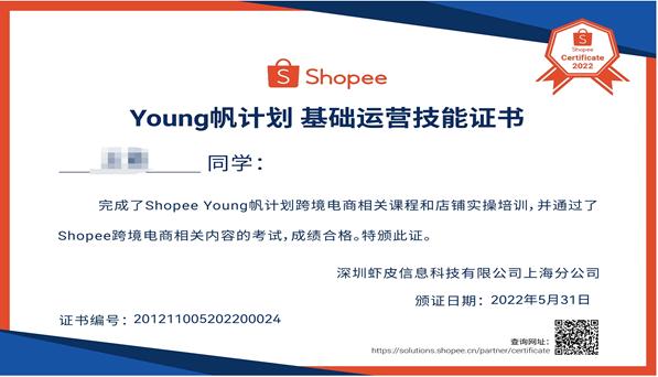 专业构建了 “三融通、四结合”的新商科人才培养模式,即专业教育与创业教育相结合、基本素质与职业品质相结合、社会能力与岗位能力相结合、人人教育与拔尖培养相结合的培养模式,以产教融合为主线,以“行业化”为方向,“项目化”为措施,培养高素质高技能的跨境电商人才。在新商科培养模式的引领下,跨境专业学生的理论知识和专业技能得到快速提升,“1+X”跨境电商B2B数据运营职业技能等级(中级)证书和“1+X”跨境电商B2C数据运营职业技能等级(中级)证书通过率高达98% ,远高于全国平均水平。“Shopee” Young帆计划基础运营技能证书考试通过率100%。