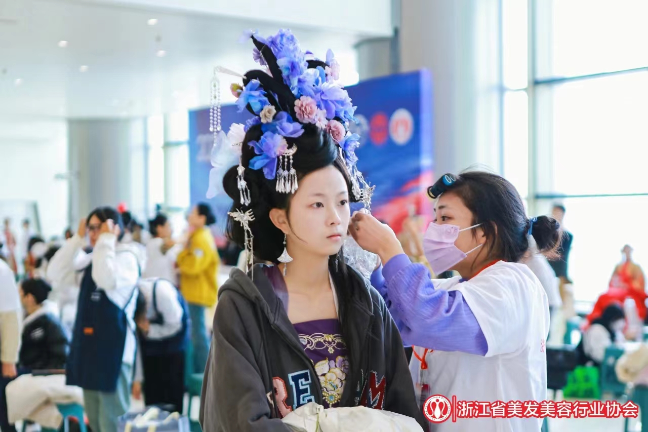 学生叶爽(右一)获得2024浙江省美容美发职业技能竞赛新娘组一等奖